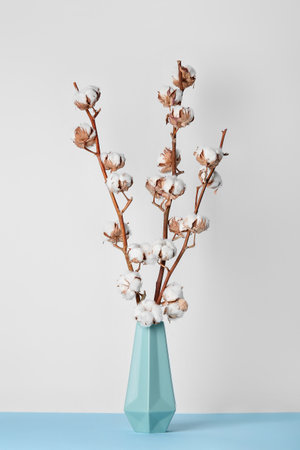 Delicate Cotton Blossom Arrangement with Elegant Backdrop and Soft Blue Tones in Sustainable Style