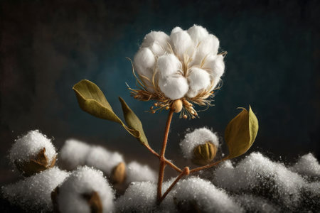 Close-up of natural cotton bolls on stems with a dark, moody background for contrast