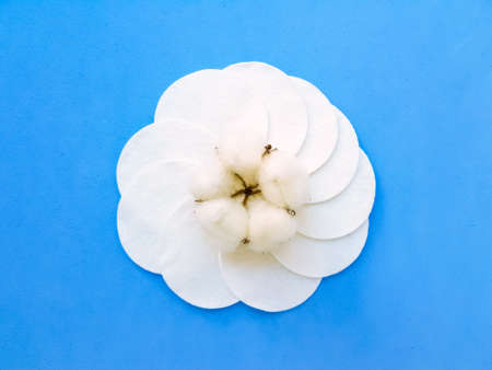 Round cotton discs and cotton flower on a bright blue background. High quality photo
