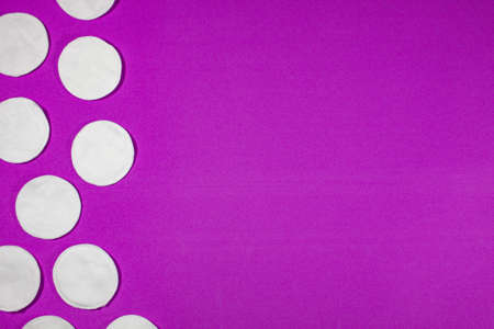 arrangement of cotton pads from the side on a purple background. view from the top