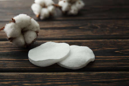 Dry blossom cotton with cotton pad close up on wood desk.