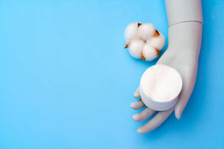 Round cotton discs and cotton flower on a bright blue background. High quality photo