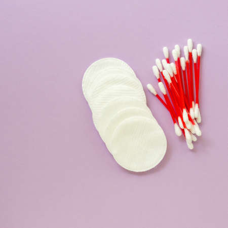 Flat lay of hygiene products. Cotton pads and ear sticks on a lilac background.