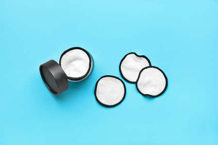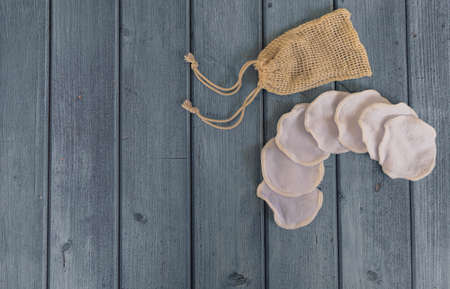 Zero waste lifestyle concept. Reusable hygiene products. Natural cotton pads, make-up remover, eco bag on blue wooden background. Eco-friendly face cleansing accessories