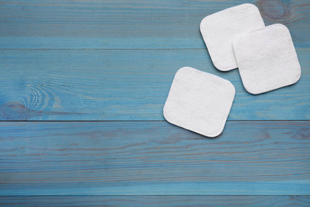 Clean cotton pads on light blue wooden table, flat lay. Space for text
