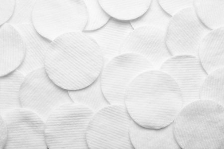Many cotton pads as background, top view