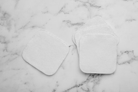 Clean cotton pads on white marble table, flat lay