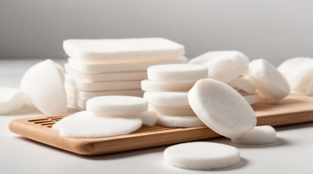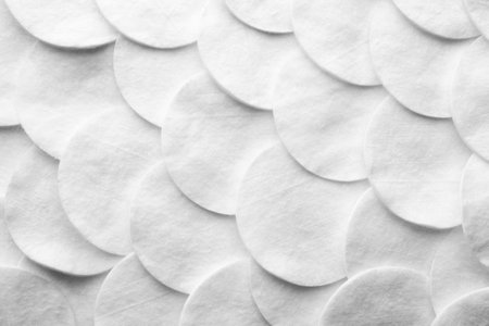 Cotton pads spread out on a white background, capturing softness and cleanliness, suitable for beauty or personal care.