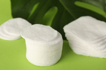 Clean cotton pads and leaves on green background, closeup