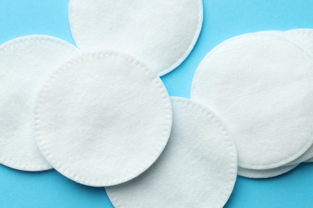 Clean cotton pads on light blue background, flat lay