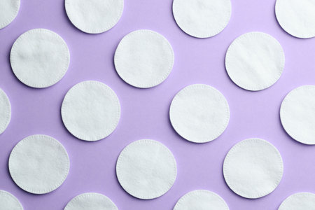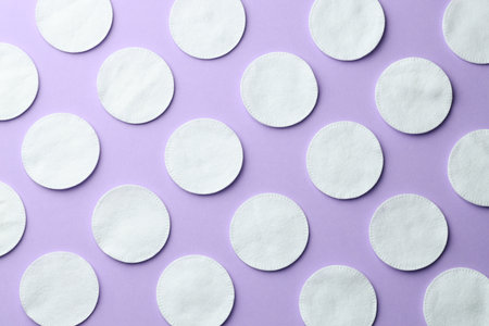 Clean cotton pads on lilac background, flat lay