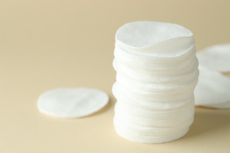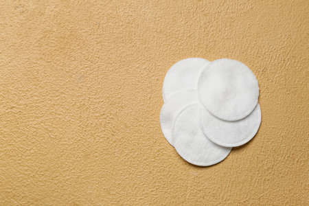 Stack of clean cotton pads on beige background, closeup. Space for text