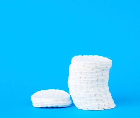 Cotton discs stack on blue paper background