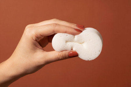 A female hand with elegant terracotta manicured nails gently squeezes a soft white cosmetic foam sponge against a matching solid brown background studio setting.