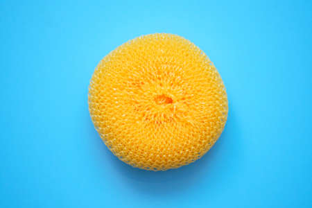 Plastic round dishwasher. Yellow dishwasher for cleaning the kitchen on a blue background. Coloured kapron sponge for washing pans.