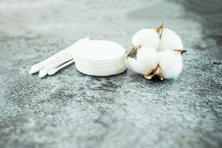 Cotton flowers with soft makeup pads and cotton buds on grunge cement texture background.