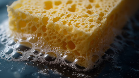 Yellow sponge in soapy water creates bubbles, evoking cleanliness and household hygiene. Close-up shows texture and absorbent qualities, ideal for conveying freshness and satisfaction in chores