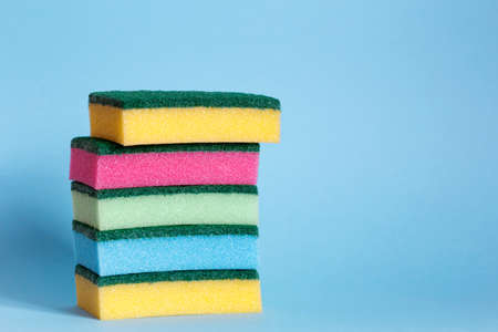 A pile of colorful cleaning sponges on blue background. Cleaning service and spring cleaning concept