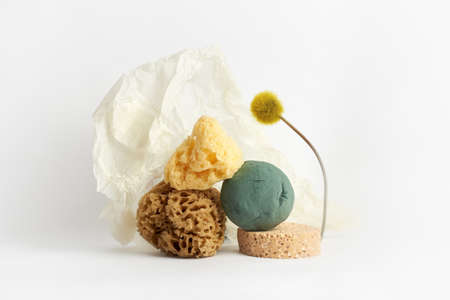 Natural sponges, wrapping paper and flower on white.Creative concept still life photography. High quality photo
