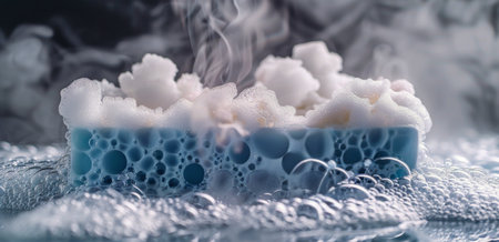 The image features a vibrant yellow sponge immersed in foam, with bubbles surrounding it. The close-up perspective highlights the texture of the sponge and the blue background creates a refreshing cleaning atmosphere.