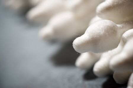 White cotton balls, closeup, texture, background, top view. Natural eco-friendly material, selective focus. Product for daily cleaning and personal care