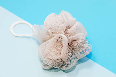 Porous sponge for washing dishes and cleaning in the apartment on a blue background. The concept of using environmentally friendly detergents for the home.