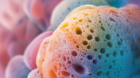 This colorful microscopic view showcases complex cells and biological structures, revealing diverse patterns and textures under magnification.