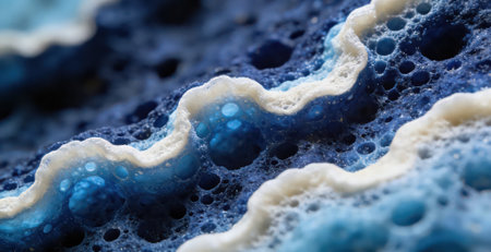Extreme close-up of a vibrant blue sponge revealing its intricate cellular structure and numerous circular pores.