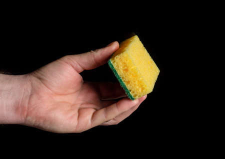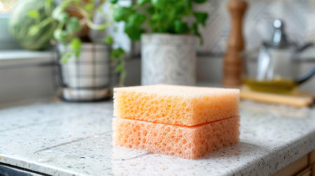 Close up of yellow scouring sponge on the kitchen counter top with soap scum. Concept of cleanliness and fragrance