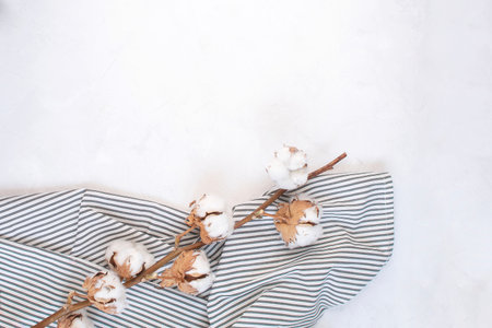 A branch of cotton on a white cloth. Concept white on white. home interior. top view
