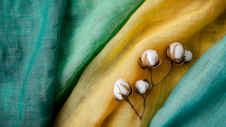 A cotton fabrics in shades of green, yellow and blue, showcasing the texture and softness. AI generated