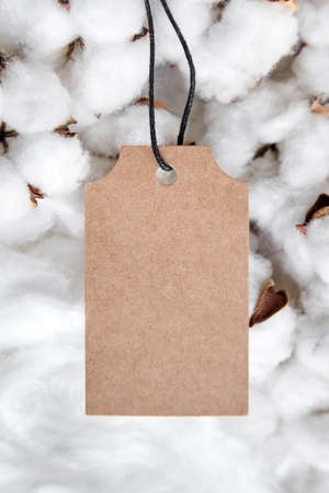Paper empty tag in brown and cotton flowers on a pink background. Blank square label. Place for text and company logo. Layout for design. Vertical. Copy space
