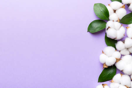 Purple cotton plant on purple fabric background. floral pattern. flat lay, top view, copy space