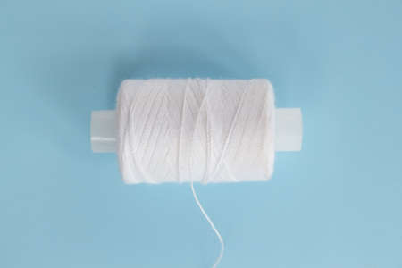Sewing production concept. Repair of clothes, sewing a new collection for the season. Spool of white thread on a blue background close-up. Minimal top view.
