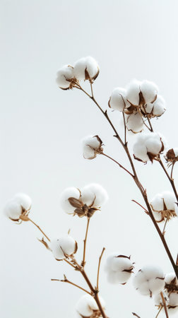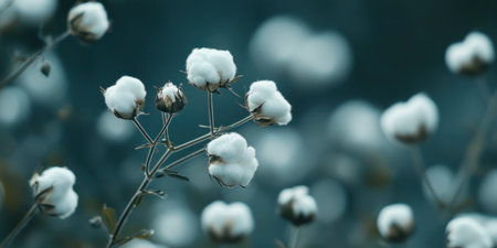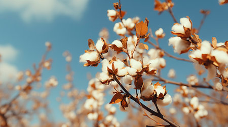 A photograph of cotton flowers, simple background, high resolution, in the style of Canon R5. --ar 2:1 --v 6.1 Job ID: 96b48b71-2486-4de3-91f1-c408b7b282e9