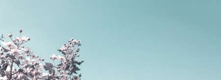 Garden blackberry flowers on blue sky background. Banner format. Vintage toned photo. Flowering season of fruit trees and shrubs. Copy space. Selective focus. Small white flowers and green leaves.