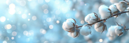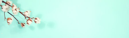 Branch with white fluffy cotton flowers on a blue background. Cozy winter banner