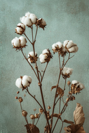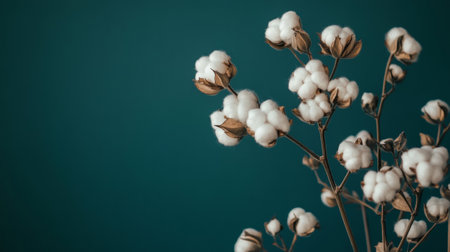 Cotton plant branches with fluffy white blooms against teal background, close-up view. Natural fibers and textile industry concept