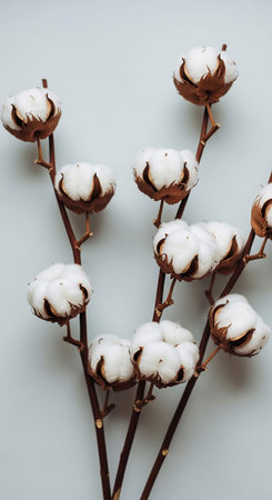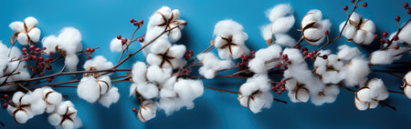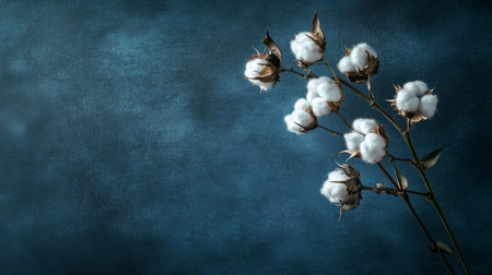 Cotton branches with fluffy white bolls on a textured blue background, side view. Minimalist nature and organic farming concept