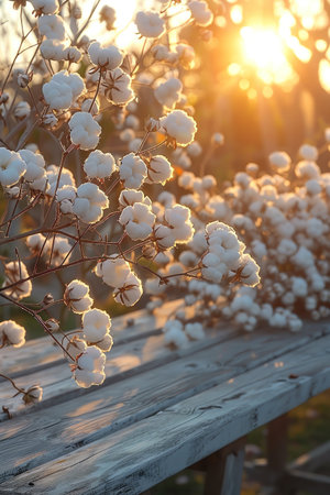 Rustic wooden table with cotton flowers in soft focus, warm sunlight, serene outdoor setting