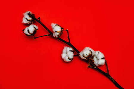 cotton branch on red background with copy space
