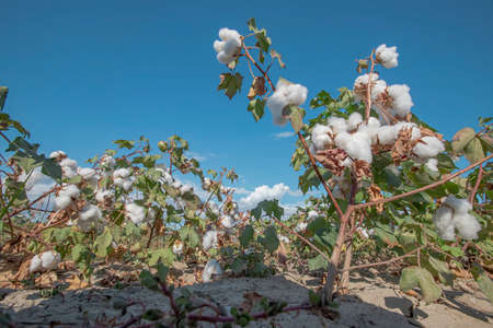 Cotton plant ready for harvesting in the field with blue sky background