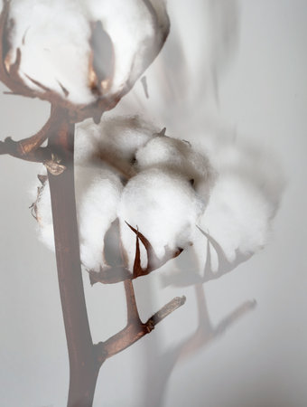 Dry cotton inflorescences on a light background in the interior shot with hard sunlight.