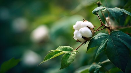 A detailed photograph of a single Cotton, swaying gently in the wind, captured in natural daylight. Fresh and airy atmosphere, soft motion blur on leaves, crisp details on textures, background softly blurred into natural greenery, cinematic natural light, realistic photography style.