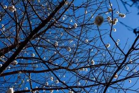 White cotton flowers on the branches of a tree in the spring.
