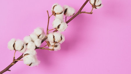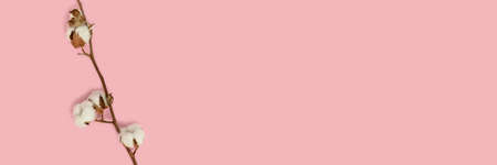 Banner with cotton branch on a pink pastel background. Minimal concept with copy space.
