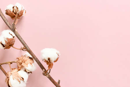 Natural Cotton flowers. Real delicate soft and gentle natural white cotton balls flower branches and pink background. Flowers composition. japan minimal style. nature cotton material for clothes.