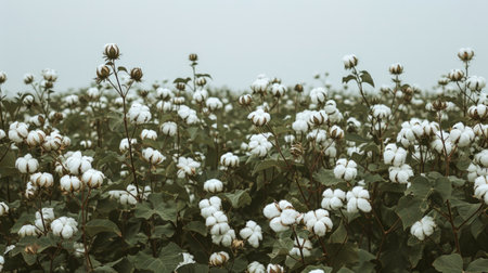 Vast cotton field in full bloom under a clear sky. Concept of agriculture, farming, crop growing, natural fiber.