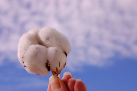 Woman hand holding dried white cotton flower isolated on white background. Fabric cloth softness natural organic farm allergy concept.
