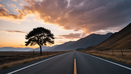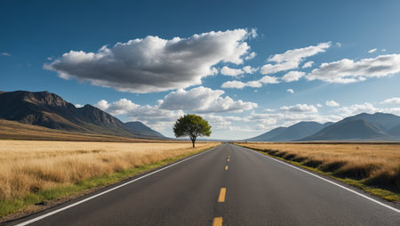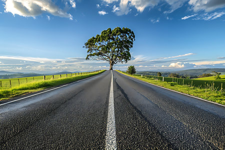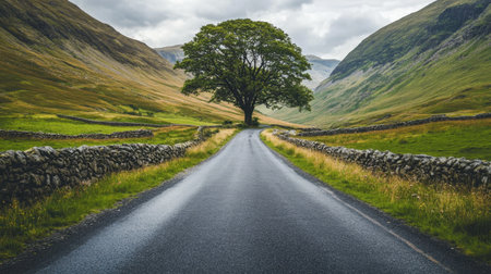 A captivating view of an open road surrounded by lush green hills, featuring a solitary tree that stands prominently against a dramatic sky, inviting explorers.